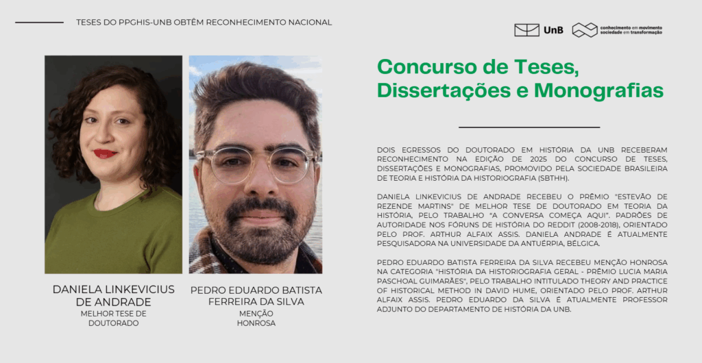 Dois ex-alunos do doutorado em História da UnB receberam reconhecimento na edição de 2025 do Concurso de Teses, Dissertações e Monografias, promovido pela Sociedade Brasileira de Teoria e História da Historiografia (SBTHH).